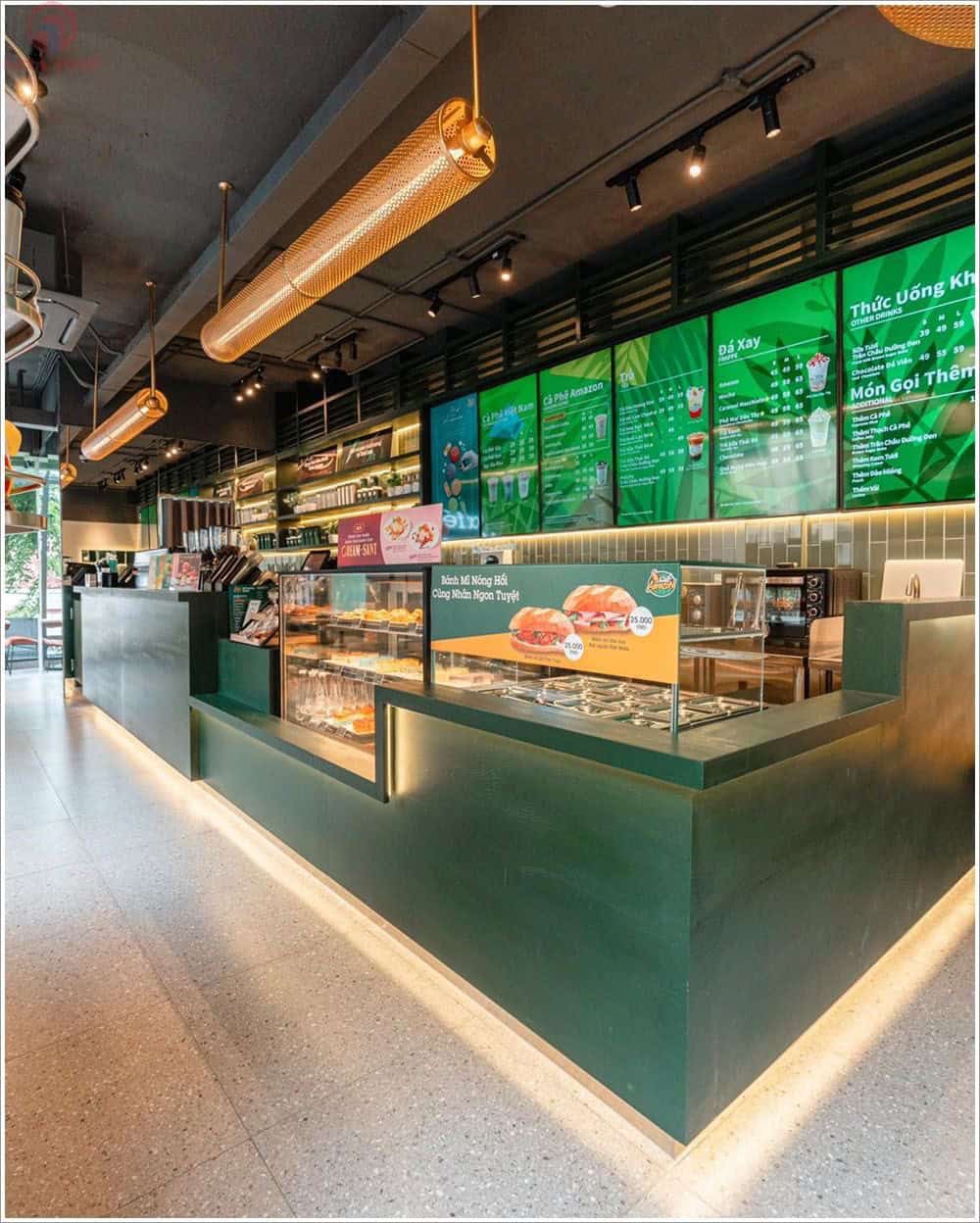 Thiết kế đơn giản nhưng hiện đại, quầy bar chữ I giúp tối ưu hóa không gian và tạo sự thông thoáng cho khu vực pha chế.